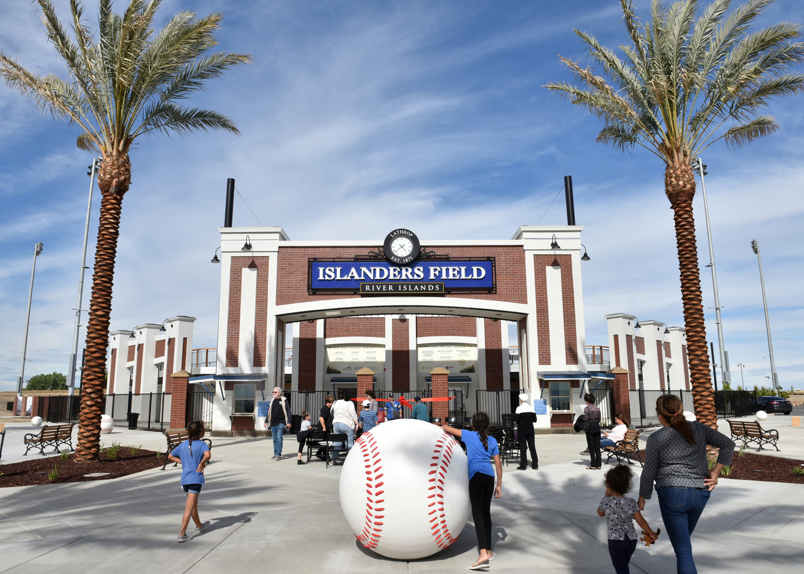The stadium is a privately-operated baseball facility located in the Town Center of the River Islands Master Planned community in Lathrop, California. The address is River Islands Parkway. The field is 390 feet in center field, and both foul lines are 330 feet. Stadium seating capacity is approximately 500. Lights, public restrooms, a scoreboard, public address systems, and batting cages are included. All game necessities must be provided by the renter. Bases will be provided by River Islands Baseball LLC. Paved parking is provided and included in this facility.